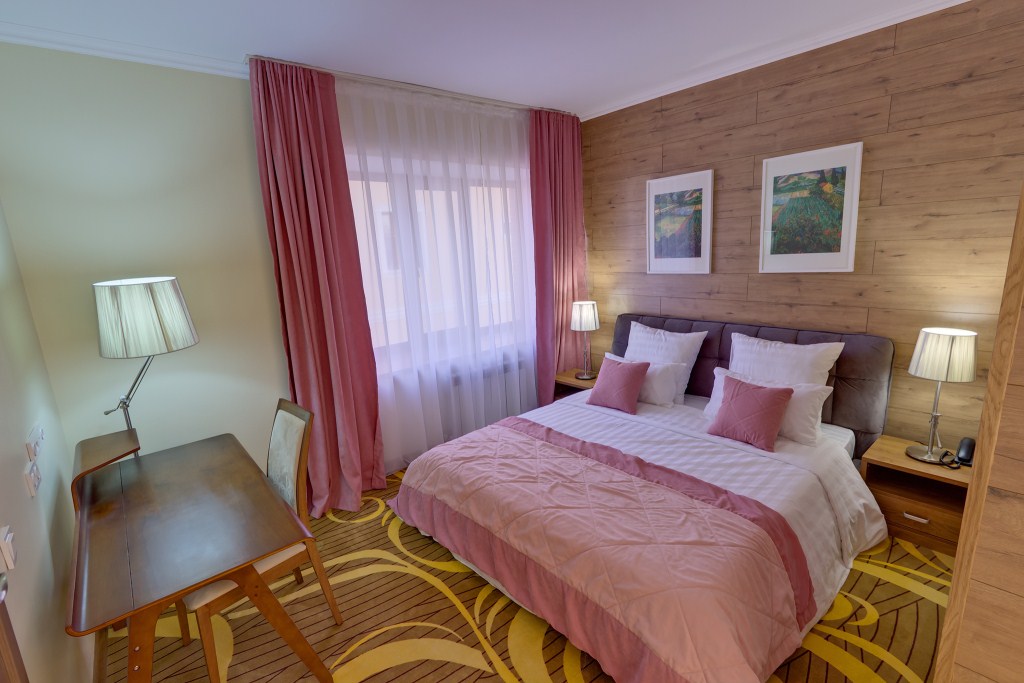 Номер «люкс» (30кв.м.) с красивым видом на бассейн оборудован спальней и дополнительно отдельной гостиной. • Кровать размером king-size